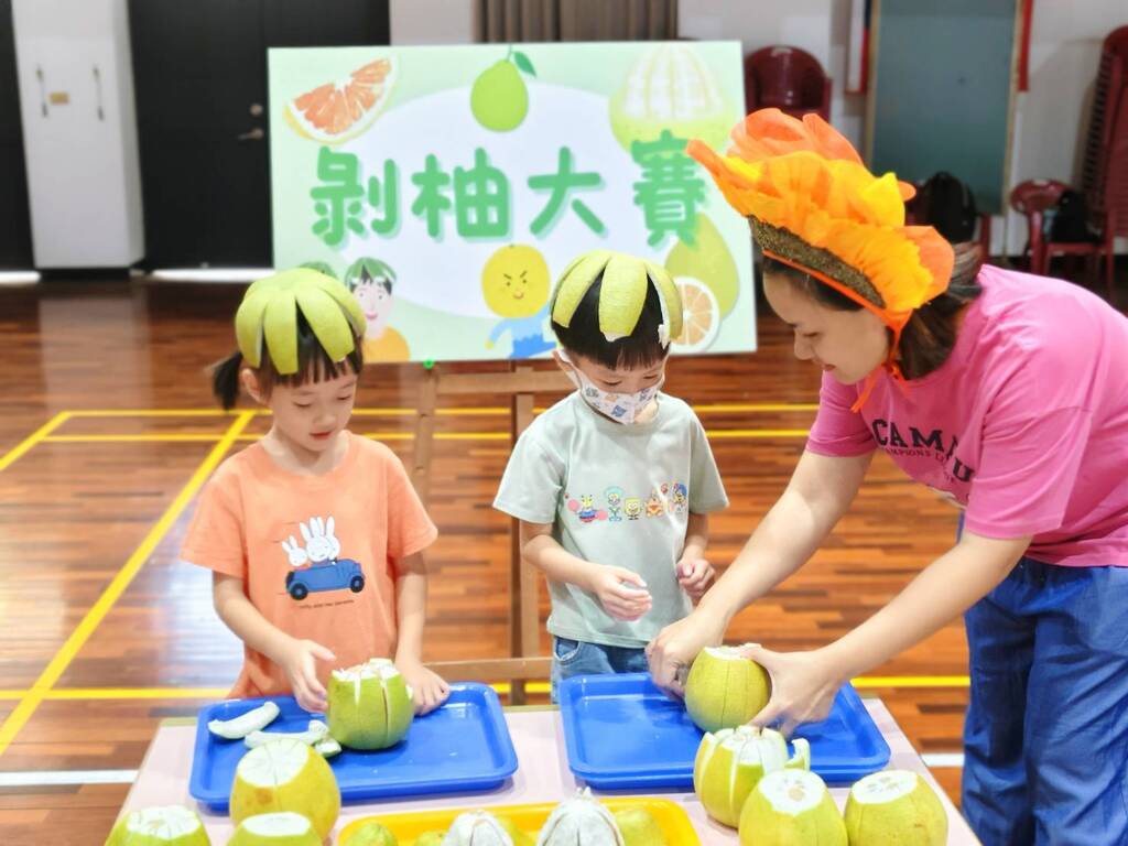 夢竹校長表示,良好的親師生合作是成功教育的基石,透過家長參與學校的教學活動,可促進親子間的溫馨互動與情感,並能提供幼生更多元的學習活動。一開場,由彤彤主任與雅婷老師、允奕與紫婷擔任開場說書人,以琅琅上口的節慶兒歌與講述故事方式傳達中秋節慶的由來。由本校稚齡童軍親子團幹部群-淑芬、依頻、靜雯、梅禎、巧玲、秀慧、珮甄、琪瑛、家齊、雅蕙等擔綱演出炙熱的大太陽,劇情中巧妙地運用十個太陽愛上學來勉勵園內新生,以降低其分離焦慮。孟育老師以生動逗趣的表演方式,演出吳剛因工作不務實、好高騖遠,長年必須留在月宮砍桂樹的原由;名晏老師、佳穎老師、佳佩老師、碧雲老師也分別飾演嫦娥、玉兔與村民等角色。最後,藉由王母娘娘所贈予富春附幼的三個【神奇仙蚌】將時事腸病毒防疫與衛生保健等融入節慶故事劇本之中,幼生取得通關密語之後即可分別獲得《聰明月餅》、《平安月餅》、《健康月餅》,寓教於樂。親師生創意大方的演出,過程趣味橫生,令人回味不已。觀賞精彩的溫馨親師生戲劇演出之後,接續是好玩有趣的節慶闖關活動-[后羿射太陽].[兔子跳跳樂].[嫦娥奔月].[歡樂撥柚趣].[吳剛伐桂].[月餅豆沙包疊疊樂],讓現場的大小朋友歡度溫馨愉快的一整個上午。