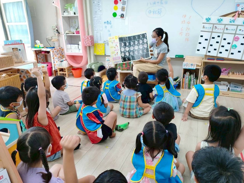 老師透過節慶大書與繪本,引導幼兒了解中秋節的起源與習俗活動,例如賞月、吃月餅與柚子等,並鼓勵孩子在假期中也可以觀察與家人都做了哪些事情呢。