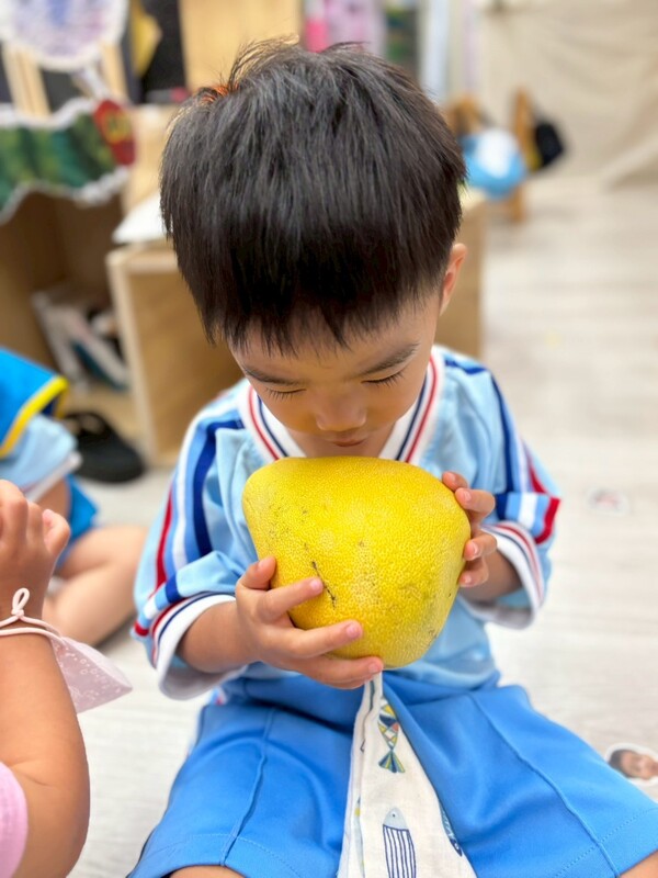 幼幼的孩子們用五感來觀察柚子,孩子們熱情地分享他們的發現,像是「香香的」、「綠綠的」、「甜甜的」,展現細膩的觀察力。老師也向幼兒分享〈切柚子〉的手指謠,不只有趣,也幫助幼兒統整其經驗呢!
