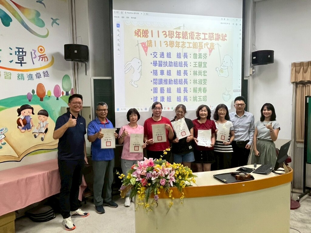 接著,校長表揚113學年市府績優志工、頒發志工感謝狀,家長會長頒贈中秋節禮物,讓會場的氣氛更加熱烈!緊接著,志工隊長馬翠蔓會務報告,10月14日開始會有5次大自然快樂操研習活動、11月8日將舉辦志工旅遊聯誼活動,前往澄霖沉香味道森林館、白人牙膏觀光工廠、月桃故事館等地區一日遊。12月13日校慶運動會當天,將在A棟川堂舉辦跳蚤市場活動。出席的志工夥伴們都非常開心,能夠有這些活動可以參與!