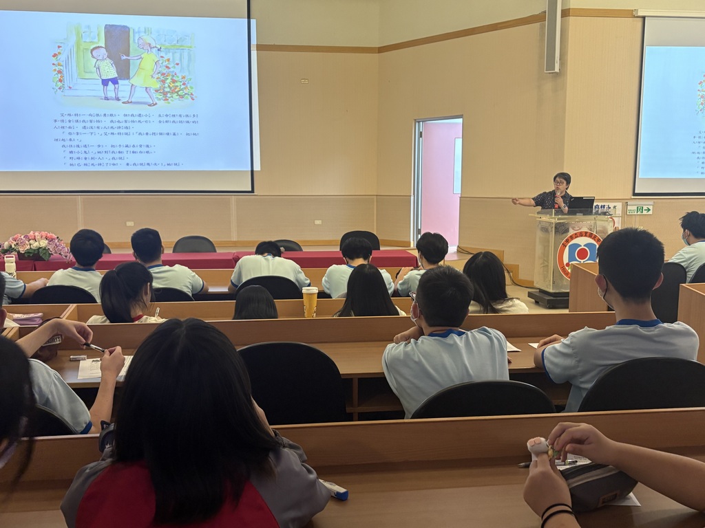 講座一開始,王治療師以繪本《世界上最棒的葬禮》揭開序幕。書中三位孩子為小動物舉辦葬禮的故事,讓同學們在輕鬆氛圍中思考「死亡」這個嚴肅議題。她以書中那句「生命很長,死亡很短,死亡只在瞬間」作為引言,提醒學生珍惜當下、理解死亡其實是生命的一部分,而非終點。