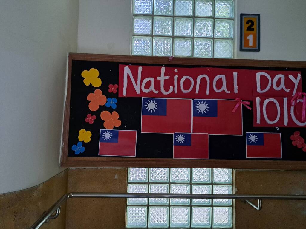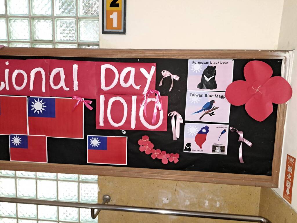 為迎接中華民國國慶日,學校外籍教師Sophie老師特別用心籌劃並親自布置了一面富有教育意義與情感溫度的「國慶專題牆」,以行動表達對台灣的尊重與熱愛。這面位於校園走廊的布告欄,主題鮮明地寫著「National Day 10/10」,搭配多面國旗、象徵台灣的特色動物(如台灣黑熊、台灣藍鵲),以及學生們親手剪貼的花朵與蝴蝶結裝飾,洋溢著歡慶的氣氛。