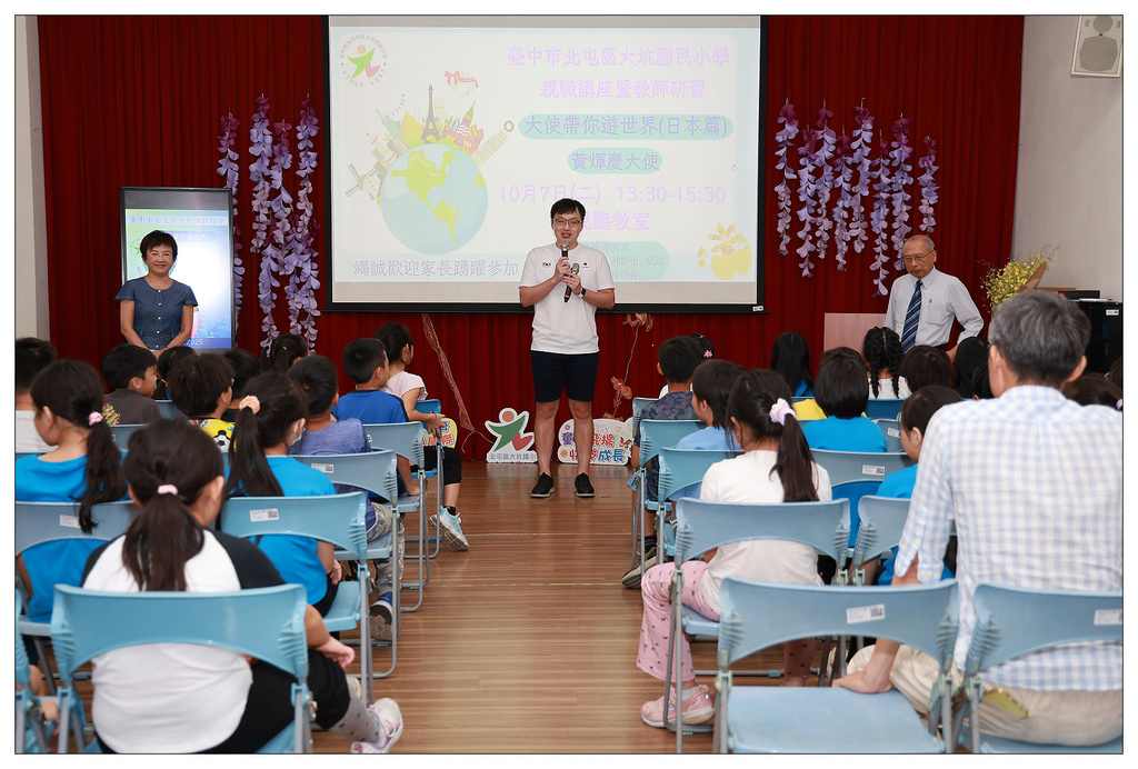 為了讓學生從小拓展國際視野,感受多元文化的魅力,大坑國小爭取到臺中市教育局辦理之「大使帶你遊世界」競爭型計畫,於10月7日舉辦「日本文化大哉問」活動,邀請前駐日秘書組長黃煇慶教授帶領全校親師生一起探索充滿魅力的日本。活動內容生動活潑,融合文化體驗與知識問答,現場笑聲與驚呼聲不斷,掀起一波「日本風」熱潮。