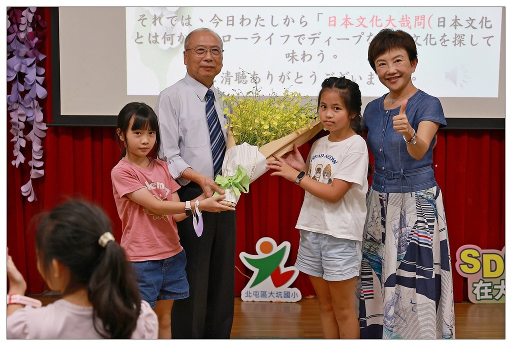 最令人期待的是「日本文化大哉問」,學生林筠諺問:大使最推薦的美食是什麼?大使推薦一定要嚐嚐道地美味的鐵板燒和涮涮鍋。在趣味中學習異國文化知識,讓去過日本的孩子溫故知新、沒去過的孩子也打開視野,每個孩子閃亮亮的眼神,讓大使頻頻誇讚大坑孩子熱愛學習、有禮貌。