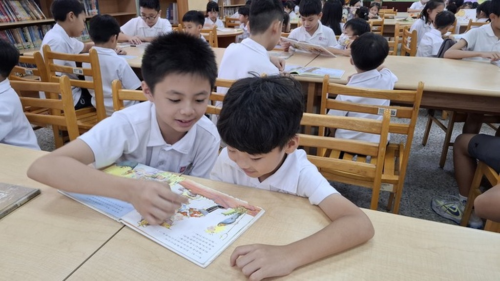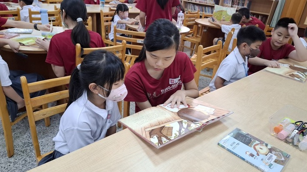 在圖書館裡,高年級的哥哥姐姐,一對一說故事給一年級弟弟妹妹聽。利用繪本的圖文對照,加上動作、音調、音色和表情變化,哥哥姐姐們使出渾身解數,一邊透過各種技巧讓故事更生動,一邊與一年級的弟弟妹妹們互動,透過詢問了解他們是否聽懂故事內容。