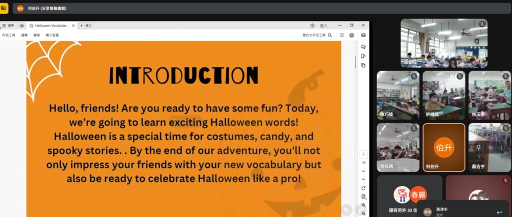在10月的微涼秋意中,潭陽國小於本週三舉辦了一場別開生面的「母語日」活動,由外師Sophie透過線上教學方式,帶領學生們進入充滿奇幻色彩的萬聖節主題課程。雖然彼此隔著螢幕,但溫暖與活力卻絲毫不減,孩子們的笑聲透過耳機傳遞,讓人感受到語言學習中最真摯的熱情。