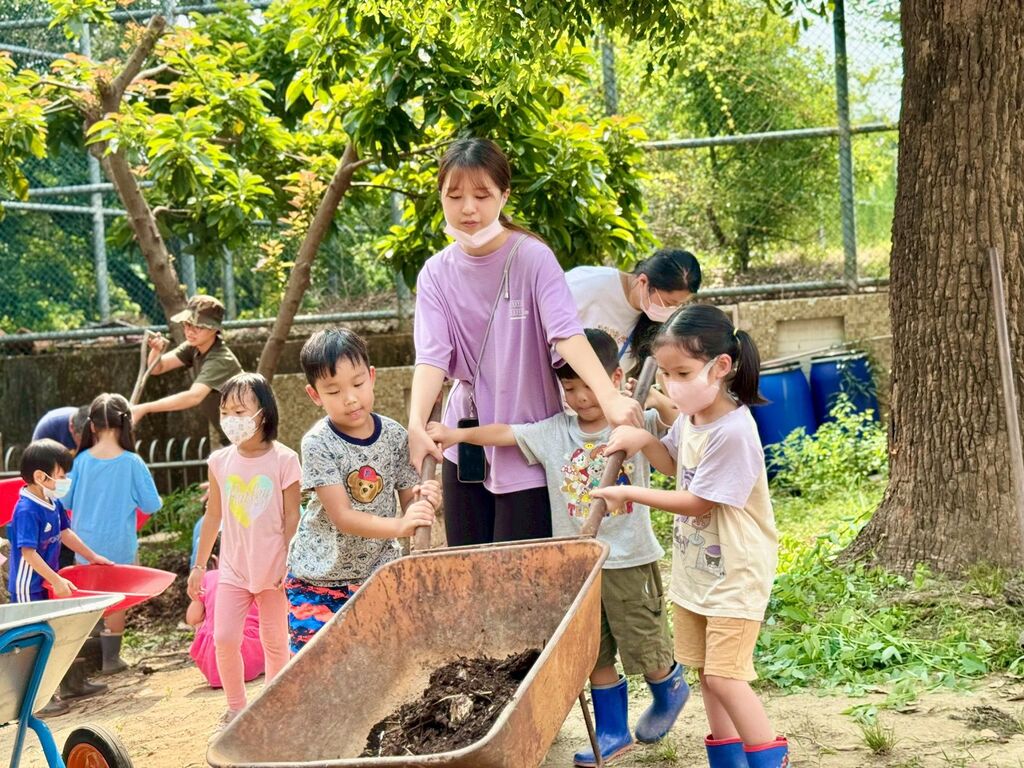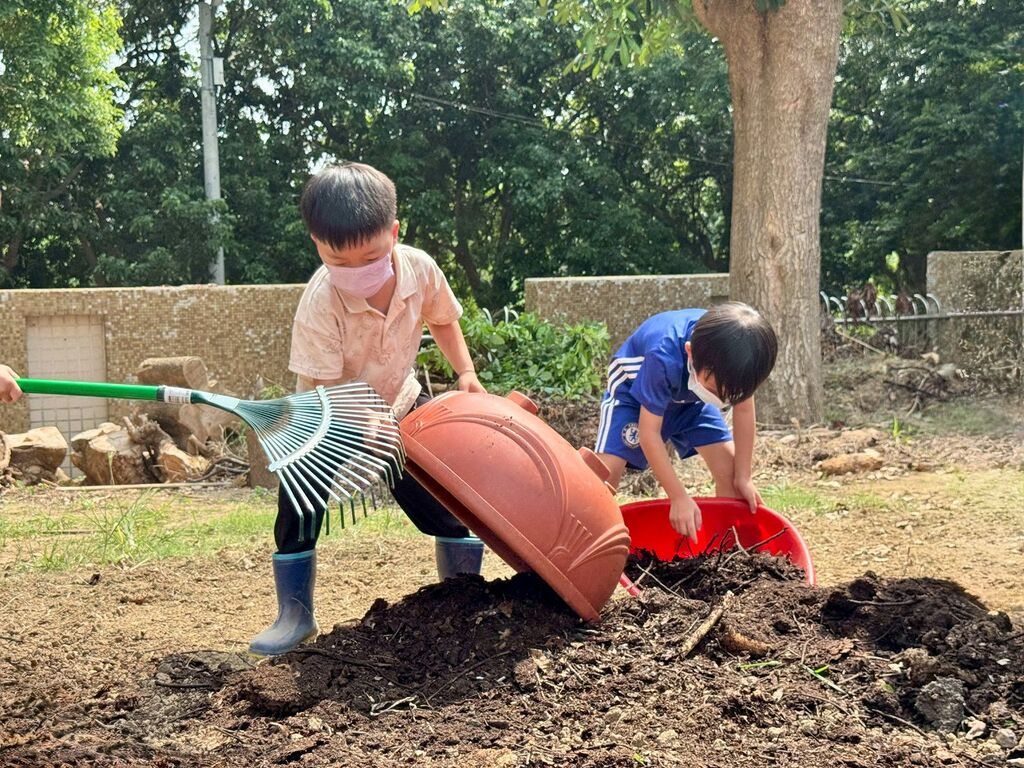 李佩珊老師說:「今天跟著園長爸爸開挖落葉堆肥區,幼兒看到那黑嚕嚕的堆肥不僅不怕,還很興奮的照著園長爸爸說的工作流程進行:搬運堆肥、用耙子耙平。最讓幼兒感到又怕又好奇的是那肥肥軟軟的雞母蟲,大家正尖叫著『有蟲!!!! 』時候,一個小小身影伸出小手爪起它,並跟大家說它是雞母蟲、他平時會吃果凍...。大家用鏟子鏟著落葉推肥、用畚箕搬運著落葉堆肥、用搬運車搬運落葉堆肥、用耙子撥平堆肥,堆肥很重、天氣很熱,但小孩小臉上掛著開心,完成任務的大家都開心的跳啊跳的!期待小班弟弟妹妹們的紅豆大收成!」教務組長蕭文嘉說:「今天進行學校土質改良活動,多虧山羌班孩子們的幫忙,他們賣力地鏟土、運土,讓大片土地能夠吸收更多養分,相信小班的紅豆一定能長得更加壯碩。