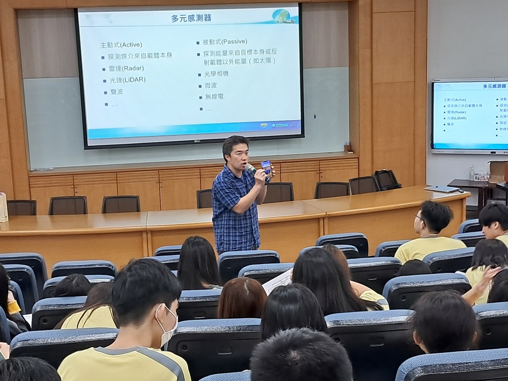 教授介紹主動式與被動式雷達的差異,舉例如手機的臉部辨識即是利用光達技術(主動式),讓同學一聽就懂。介紹各種波段的特性,如何應用於觀測不同農作物或水體以及不同建築物等地表覆蓋類型。如何應用AI做快速分類辨識。最後也介紹許多衛星影像圖資,如太遙中心的衛星影像申請、TGOS等,並鼓勵學生應用資源參加比賽。