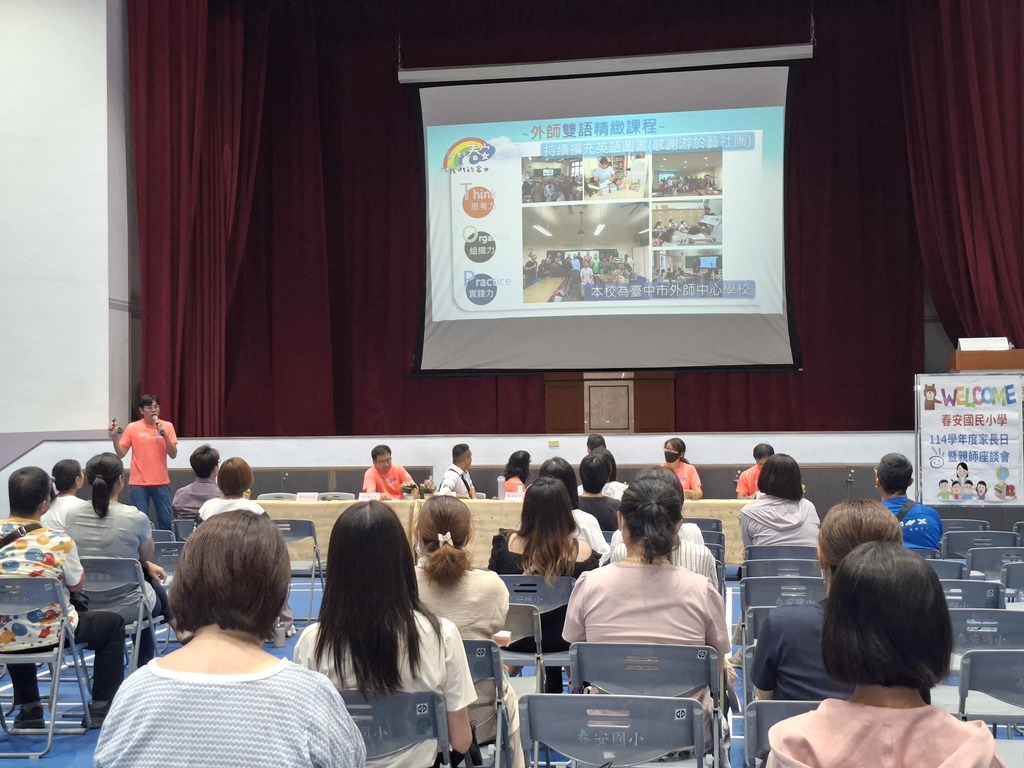 🍎接著登場的是全校家長座談會,校長向所有家長介紹學校的辦學理念與未來新校舍建築的願景,各行政處室也精心準備了校務報告簡報:教務處說明了春安的精緻課程、外師雙語課程、春安閱讀第一,學務處則介紹了多采多姿的社團活動與三好校園、品格教育課程,總務處報告新校舍興建進度、家長會業務等,而輔導室則分享一些活動照片來說明承辦的業務。最後則召開家長大會,推舉出家長委員,為今天的家長日活動畫下圓滿的句點。