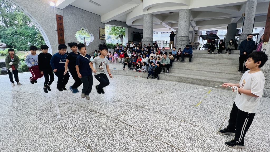 「嗶!」哨聲一響,桐林的小小選手們開始奮力甩動手中的跳繩,一左一右,腳步輕快的躍過繩子,不畏寒冷,桐林國小第一次的跳繩比賽正式登場!