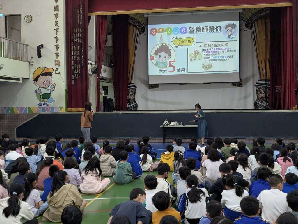 活動中,莊營養師透過生動的解說,提醒孩子們落實「睡足8小時、5蔬果、少看3C(2小時)、運動1小時、0含糖飲料」的生活守則。講座深入淺出,引導學生檢視日常飲食與作息,現場孩子們熱情響應,大聲喊出「身體健康我和你」的口號,氣氛熱絡。