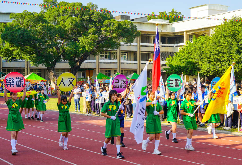 忠孝國小130週年校慶運動會,會旗進場。 由中華民國國旗、臺中市市旗及忠孝國小校旗所組成的旗隊。 在旗隊前方引導,是由五名幼童軍手持主動、人文、品格、樂觀、合作 ; 所呈現忠孝國小的辦校願景。 旗隊的孩子們正以整齊的步伐,神采奕奕的通過司令台前方,正代表忠孝師生氣勢如虹! 大會會旗由8位女童軍護旗,代表的是大會最崇高的精神象徵,會旗冉冉上升,迎風飄揚,在高空俯視著我們,告訴我們要發揮運動員的精神,展現最完美的演出。 #忠孝130