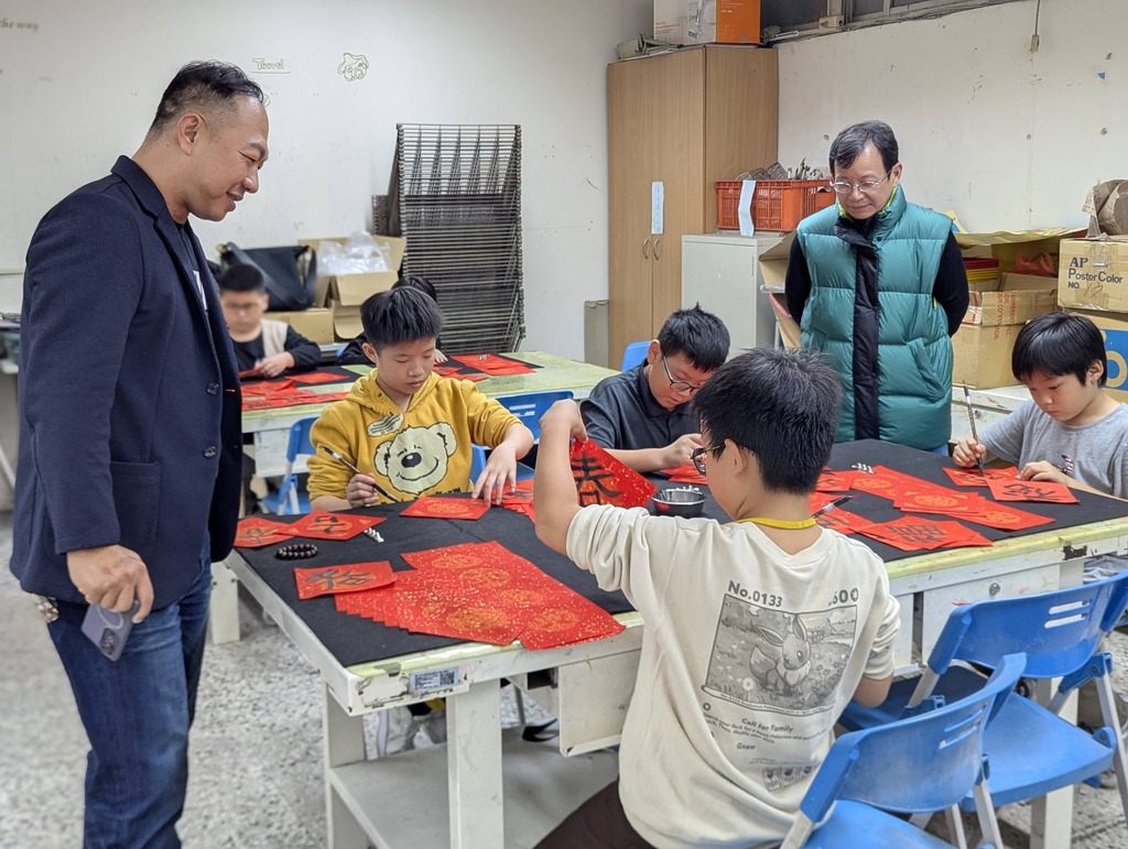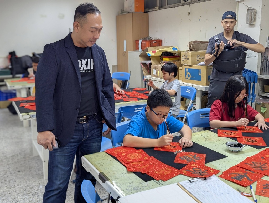 為關心學童學習狀況,基金會執行長許峻郎今日特別親臨學校,在校長黃富揚陪同下,親切地為孩子們加油打氣。許執行長勉勵學子們持續精進,讓珍貴的書法藝術文化在校園中深耕茁壯。