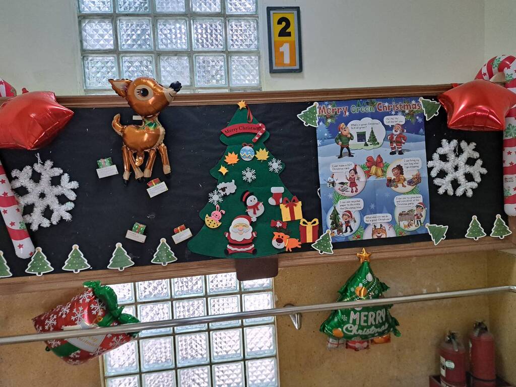專欄中央是一棵繽紛的聖誕樹,聖誕老人、雪人與小動物們熱鬧登場,彷彿正在準備一場歡樂派對;右側則結合英文學習與環保概念,推出「Merry Green Christmas」主題內容,讓學生在欣賞佈置的同時,也能認識綠色聖誕的意義。這次的佈置不只是裝飾,更是一堂走廊上的文化課,讓聖誕節的歡樂與學習悄悄走進校園每個角落。