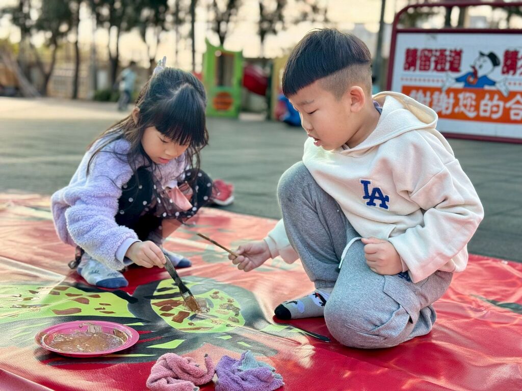 南屯幼兒園以食農課程作為核心本位之一,而其中最為人知、也延續多年的傳統活動,便是每年過年的圍爐活動。全園各班都會採收這學期細心照顧的作物,並一同為年菜佳餚做準備。除了飲食活動外,新年的環境佈置也從未停歇。延續去年十三條、長達十尺春聯所營造的壯觀氛圍,今年配合即將到來的馬年,特別繪製了一幅長達二十尺的巨幅畫作「十四駿迎春」。這幅作品近日即將懸掛於校園建築的大牆上,展現雷霆萬鈞、一馬當先的磅礴氣勢。