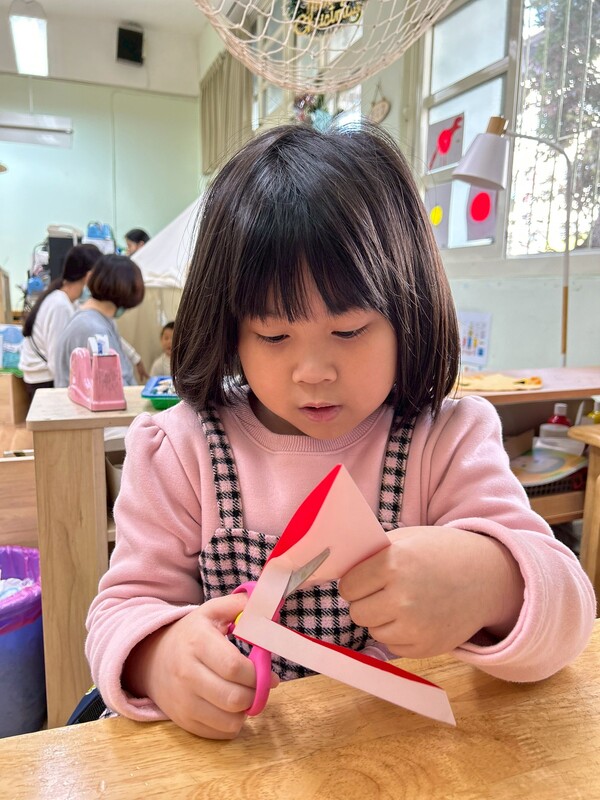 在美勞區中,孩子們進行窗花剪紙,剪出象徵吉祥的圖案與文字,張貼在窗戶上,感受「辭舊迎新、驅邪納福」的節慶氛圍,表達對新的一年平安、健康、財富與團圓的美好祈願,同時練習摺紙與剪刀操作,提升精細動作與手眼協調的能力。
