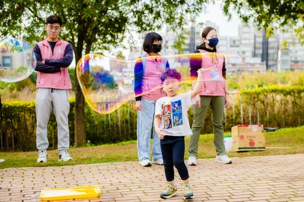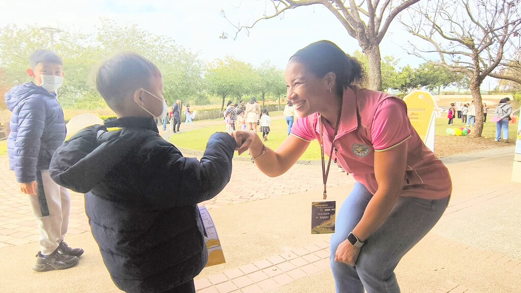 活動一開始,外師 Shari、Alan、Leon 就用活潑的 Say Hello to DONG HAI 暖身活動迎接這群來自幼兒園的孩子們。小朋友們精神滿滿地用 High five、First bump、Wave、Hand shake 四種方式跟外師問好,一下子就熟絡起來。校園中還設有 泡泡體驗區和 AI 機器人操作區,孩子們一邊探索校園,一邊驚呼「好好玩!」,熱鬧的笑聲在空氣中不斷回響。