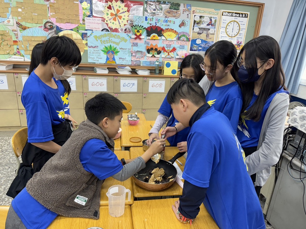 這堂課程同時融入英語學習元素,Teacher Josh 與 Teacher Ruby 透過英文介紹甜點由來與製作方式,讓學生在實作中自然接觸生活英語。老師也向學生說明:「Puppy Chow (also called Muddy Buddies) is a popular American snack and dessert. Even though its name sounds like dog food, it is not for dogs. It is a sweet treat for people. It is made with cereal, chocolate, peanut butter, and powdered sugar.」透過真實情境的語言使用,孩子們在做中學、學中用,提升了學習動機與理解力。