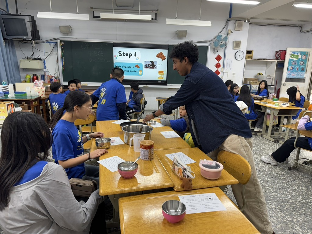 Teacher Josh 這次攜手 Teacher Ruby,為六年級學生帶來一堂充滿香氣與歡笑的特色甜點課程——製作美國經典小點心 Puppy Chow。課程從認識食材開始,學生們在老師的引導下,依序進行備料、加熱巧克力、混合花生醬與奶油,再耐心等待冷卻,每一個步驟都親手完成,將原本只存在於書本與圖片中的甜點,一步一步呈現在眼前。