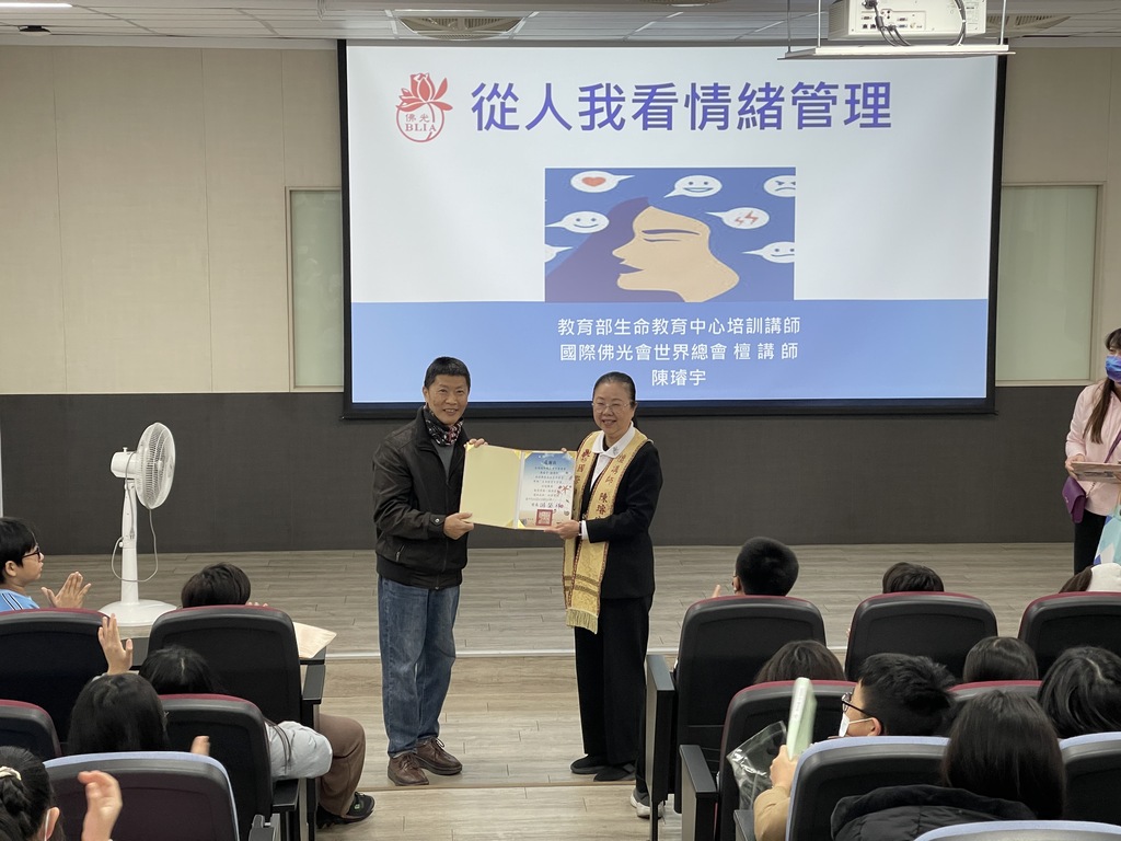 為了落實校園心理健康教育,本校輔導室於1月22日邀請國際佛光會潭子分會檀講師陳璿宇來到文昌國小,與六年級的孩子們分享「從人我看情緒管理」校園講座。
