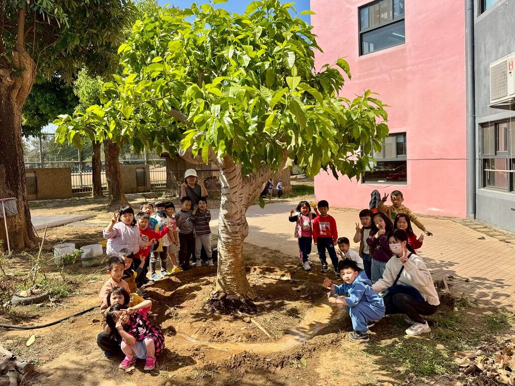 蘇怡嘉老師說:「後院的玉蘭花樹曾經陪伴我們一年的時間,那一年我們在這棵樹上發現了無數隻的綠斑蝶毛毛蟲、不知名的小蜘蛛、小黑螞蟻,還有綠繡眼媽媽築巢生蛋,短短的兩週透過手機錄影,看到鳥寶寶從肉球到長滿羽毛的模樣…,很感謝這棵樹出現在我們小班的歲月。聽園長爸爸說這陣子玉蘭花樹好像有一點點生病了,葉子上長了白點、樹幹有點乾裂了,如果它不在了,許多小生物也可能將不會再來了,加上它所處的位子水份嚴重流失,這棵玉蘭花樹需要我們幫忙拯救。今天園長帶著我們幫忙處理了水份流失的問題,我們先在樹的外圍幫忙挖了一個小小的水池,園長爸爸有教我們使用鋤頭挖土,雖然鋤頭比我們還高而且很重,但是我們大家都很努力的幫忙挖水池,還撒了肥料給它,因為我們想要玉蘭花樹可以變得更健康,我們還對它說了甜甜的話,希望它能長出翠綠的葉子,開出漂亮又香的玉蘭花,吸引更多小生物來我們的後院。」園長陳議濃表示:「這次玉蘭花集水圈的開鑿,白兔班的孩子們展現了高度的工作默契與執行能力。不僅在分工時能互相協助,也能依照每個指令把工作的細節做到最好。無論是辛苦的開鑿工作,或是整理周邊的落葉,都能看到孩子們的能力與行動力。也希望這棵玉蘭花在白兔班的照顧之下,能更加健康茁壯,繼續擔任學校環境教育的重要角色。」