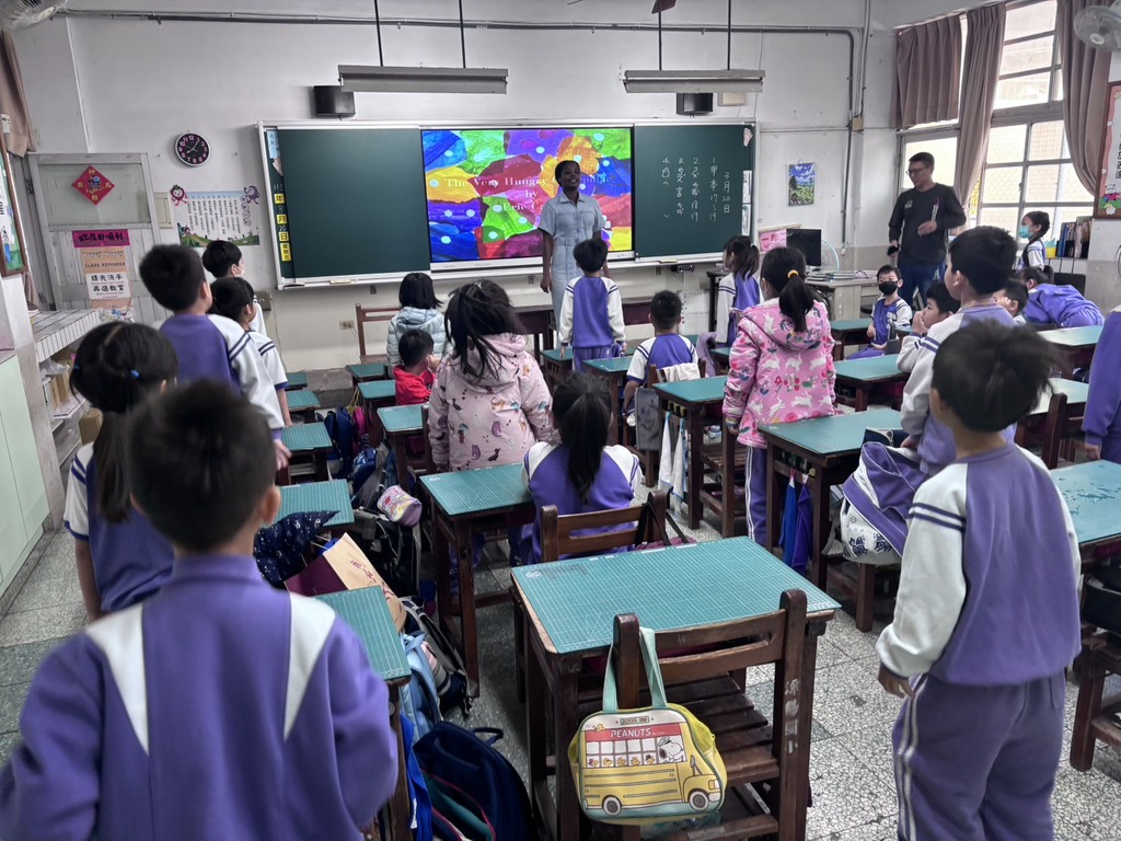 課堂一開始,Sophie 老師利用互動式電子白板呈現色彩繽紛的繪本畫面,隨著毛毛蟲吃掉一個個食物,教室內充滿了孩子們驚奇的呼聲。Sophie 老師不僅用溫柔且富感染力的嗓音朗讀,更搭配豐富的肢體動作,引導學生們舉起雙手,模仿毛毛蟲蛻變成蝴蝶的過程,讓抽象的單字轉化為具體的體感記憶。