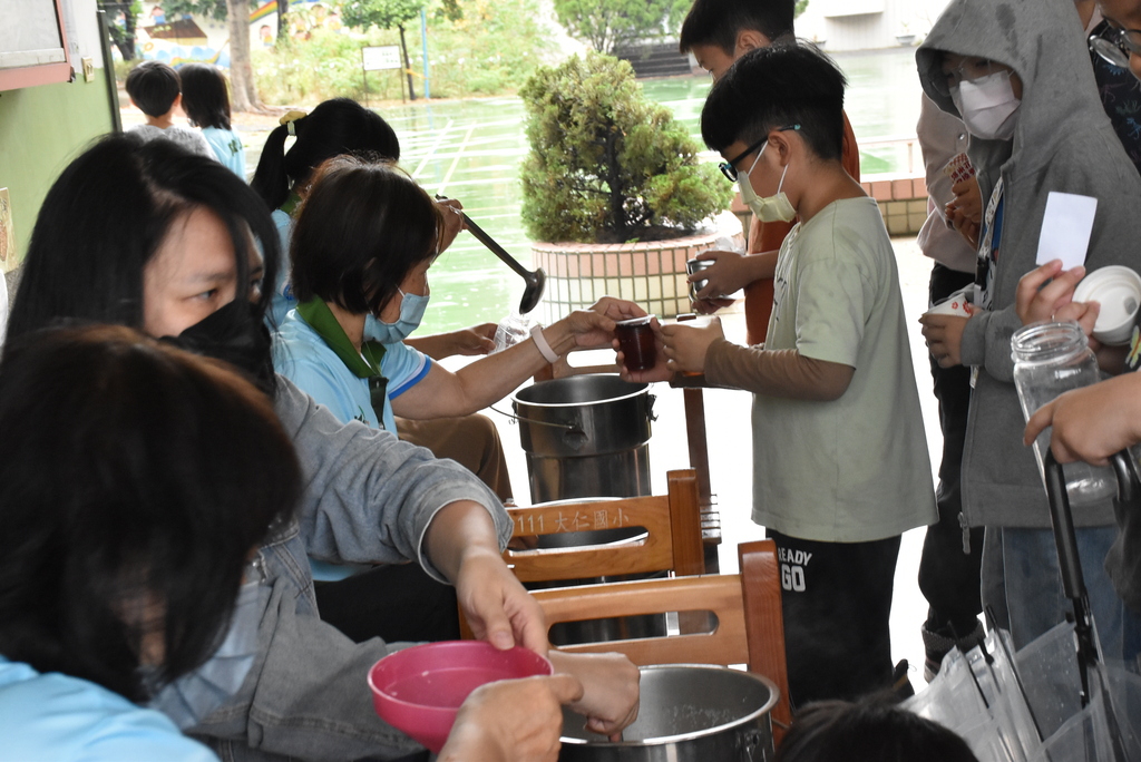 雖然天空飄著細雨,但大仁國小的走廊與光電球場卻顯得格外溫馨。原本要在無患子樹下展開的野餐墊,如今齊整地鋪設在通風寬敞的走廊上。學生們圍坐在一起,分享著彼此帶來的點心,空氣中瀰漫著地瓜球與雞蛋糕的甜香。這不只是一場躲雨的聚會,更是一堂學會隨遇而安的品格課。